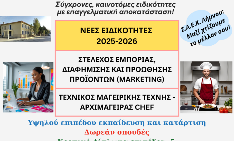 Οι νέες, σύγχρονες ΕΙΔΙΚΟΤΗΤΕΣ Α ΕΞΑΜΗΝΟΥ της Σ.Α.Ε.Κ. ΛΗΜΝΟΥ, που θα ξεκινήσουν το νέο ακαδημαϊκό έτος 2025-2026, είναι: