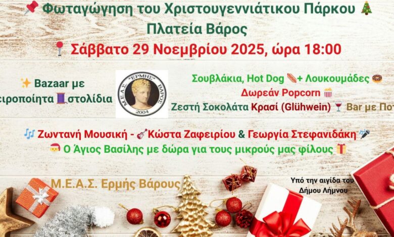 Η μαγεία των Χριστουγέννων έρχεται στη Λήμνο! Το Σάββατο 29 Νοεμβρίου 2025 και ώρα 18:00, η Πλατεία του Βάρους θα γεμίσει φως, χαρούμενες παιδικές φωνές, μουσική και γιορτινή διάθεση με την επίσημη φωταγώγηση του Χριστουγεννιάτικου Πάρκου.