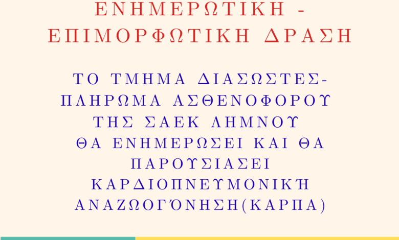 Με αφορμή την Παγκόσμια Ημέρα Επανεκκίνησης Καρδιάς «Όλοι οι πολίτες του κόσμου μπορούν να σώσουν μια ζωή», στις 16/10/2025 και ώρα: 18.00, η ΣΑΕΚ ΛΗΜΝΟΥ διοργανώνει και σας προσκαλεί στην ενημερωτική- επιμορφωτική δράση ΚΑΡΠΑ, που θα πραγματοποιηθεί στο χώρο της Σχολής, στο ισόγειο του κτηρίου στο χώρο του Γυμναστηρίου.