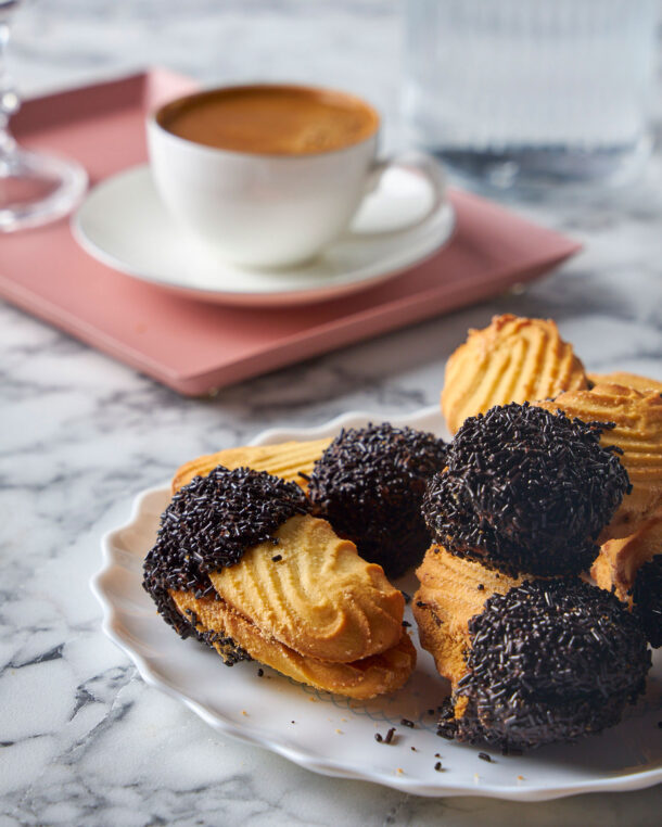 Ο τέλειος συνδυασμός για να συνοδεύσει κανείς τον καφέ, ιδίως τον ελληνικό, είναι τα πτι φουρ:  Μαλακά μπισκότα βουτύρου, με γέμιση αρωματική μαρμελάδα ροδάκινου, και τρούφα σοκολάτας!