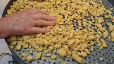Ελέγχουμε σπάζοντας ένα βραχάκι στα δύο. Πρέπει στο εσωτερικό του να μην έχει ίχνος υγρασίας και να τρίβεται εύκολα. Τρίβουμε κάθε «βραχάκι» στο κόσκινο. Απλώνουμε τον τριμμένο τραχανά σε μια λεπτή στρώση σε ένα σεντόνι και αφήνουμε και πάλι για 2-4 ημέρες να ξεραθούν καλά και αυτά.